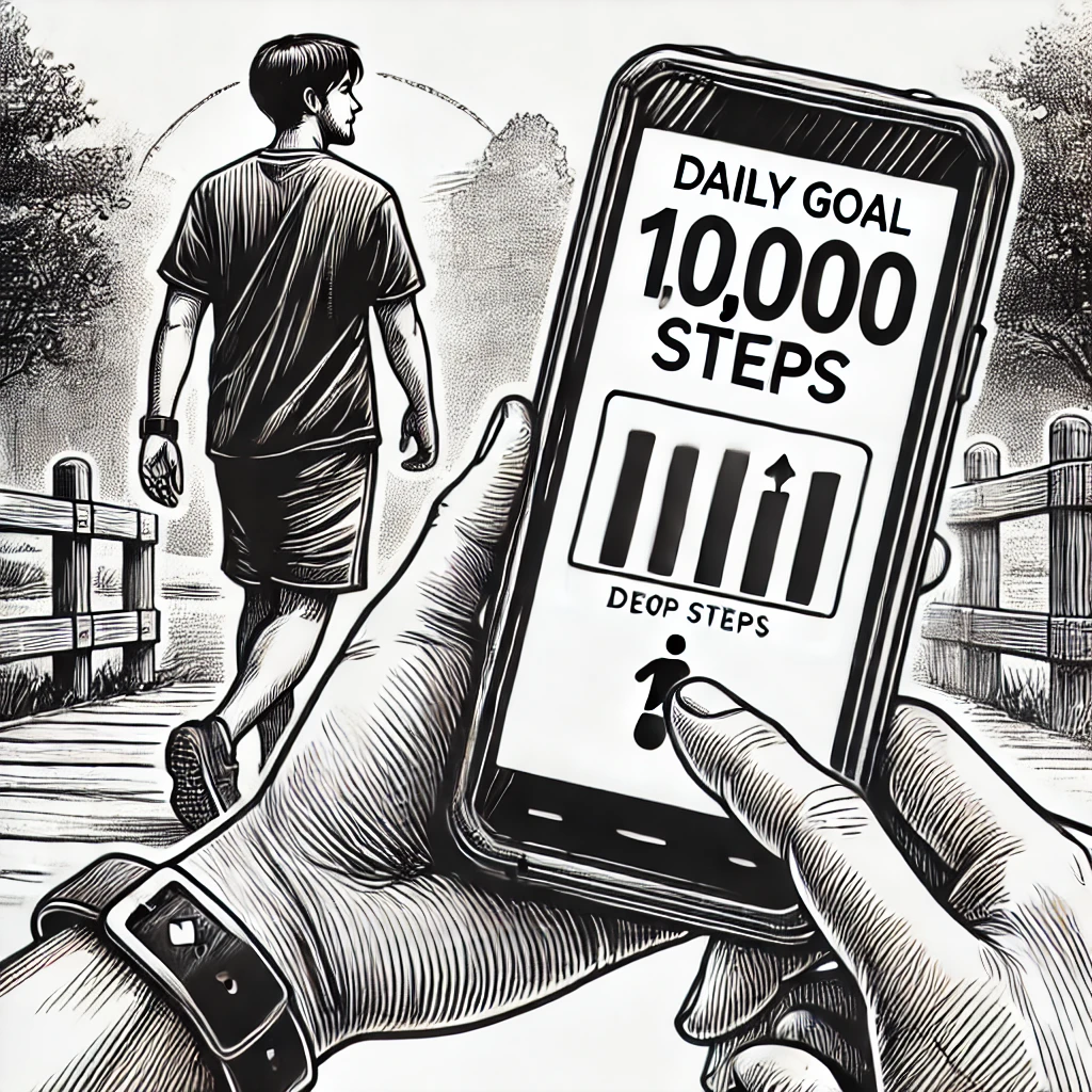 A smart step counter calculates whether you've achieved your goal for a healthy lifestyle. The goal is 10.000 steps per day. If you've walked fewer than 10.000 steps, the counter calculates how many steps you're missing. If you've walked 10.000 or more, it tells you how many extra steps you took!